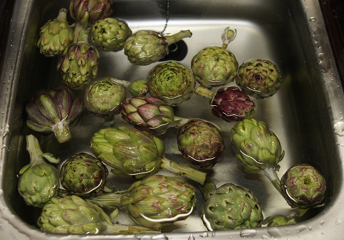 (このアーティチョークは小さいので、柔らかなガクは取っていません)